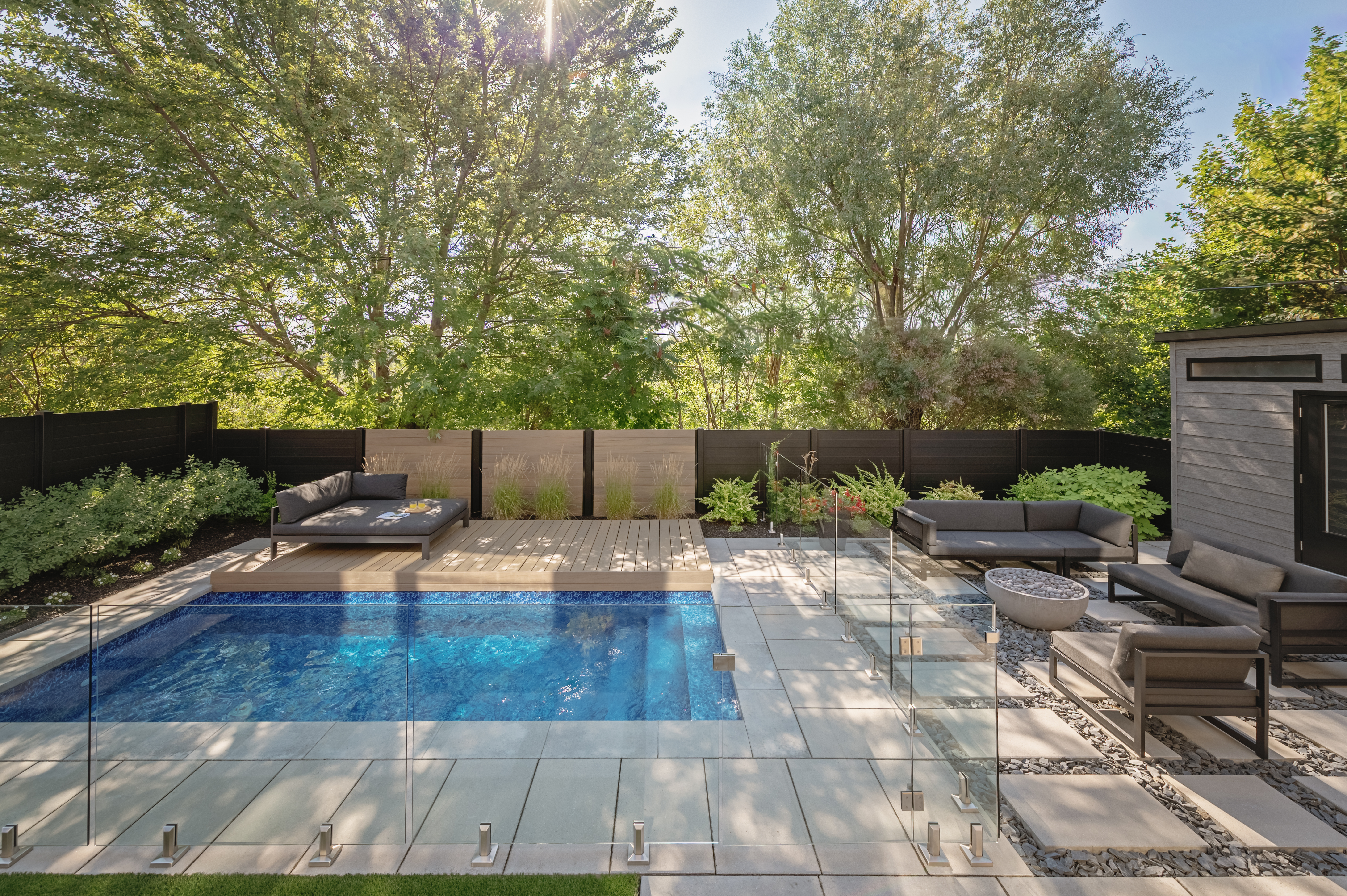 La conception a débuté par une analyse approfondie du certificat de localisation intégrant les agrandissements projetés de la résidence. Le plan d’aménagement a permis d’orchestrer l’implantation de la piscine creusée, des terrasses, des espaces de repos et des circulations tout en respectant les contraintes réglementaires et environnementales du site. Cette approche globale a facilité la coordination des infrastructures techniques : électricité, éclairage, équipements de piscine et drainage, assurant une réalisation fidèle à la vision initiale.