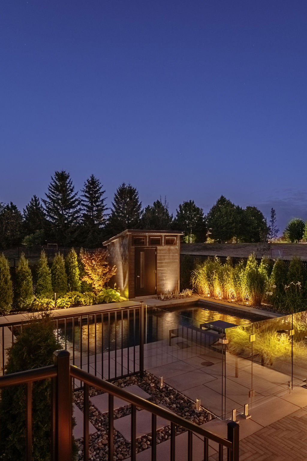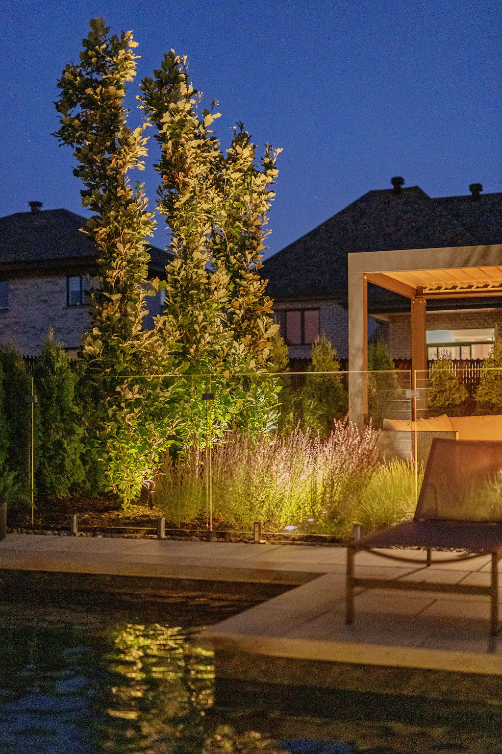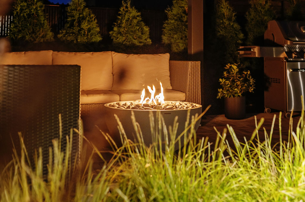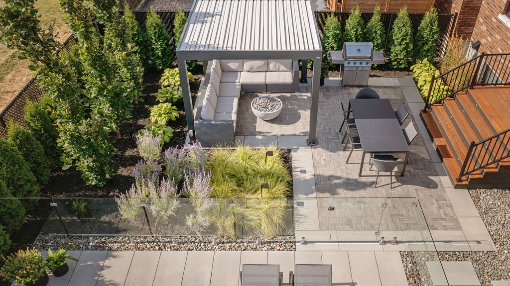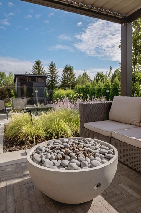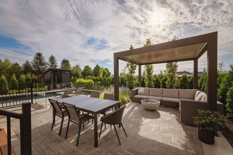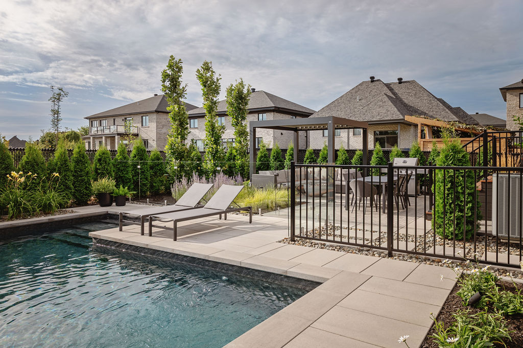 Le foyer au gaz, intégré dans la zone lounge sous une pergola bioclimatique, crée un point focal pour les rassemblements et renforce le lien entre les différents espaces. Son emplacement, combiné à l’aménagement paysager et aux éclairages, transforme cette zone en un espace multifonctionnel, confortable et esthétique, utilisable tout au long de la saison.