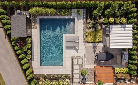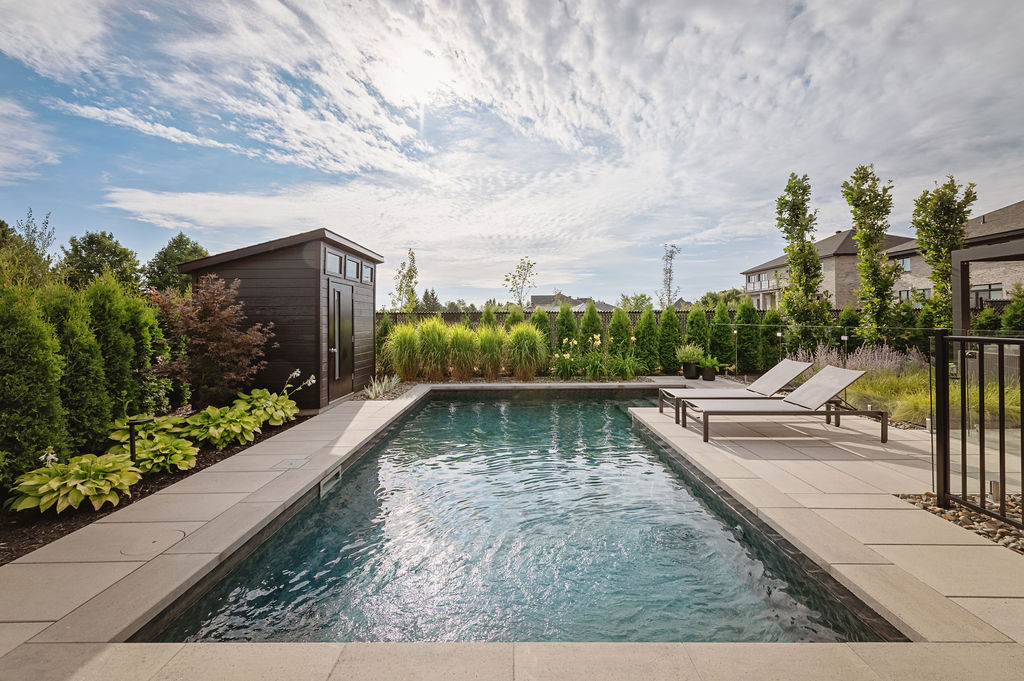 La disposition des zones de vie a été pensée pour maximiser l’usage de chaque mètre carré de cette cour urbaine restreinte. Piscine, terrasses repas et lounge s’articulent de manière naturelle, facilitant les déplacements et offrant des perspectives ouvertes malgré la superficie limitée. Chaque espace conserve son identité tout en s’intégrant harmonieusement à l’ensemble, créant un parcours intuitif et agréable du matin au soir.